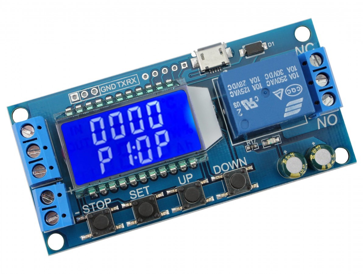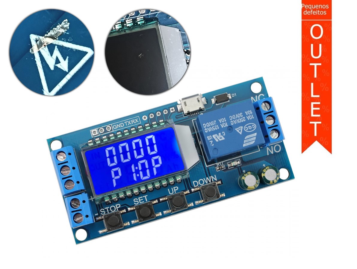 Importante destacar ainda que Relé Temporizador Digital XY-LJ02 conta com 1 display LCD com fundo azul e 4 pulsadores push button (stop, set, up, down) para ajustes, além de porta micro usb para alimentação e bornes a parafuso para as conexões elétricas.