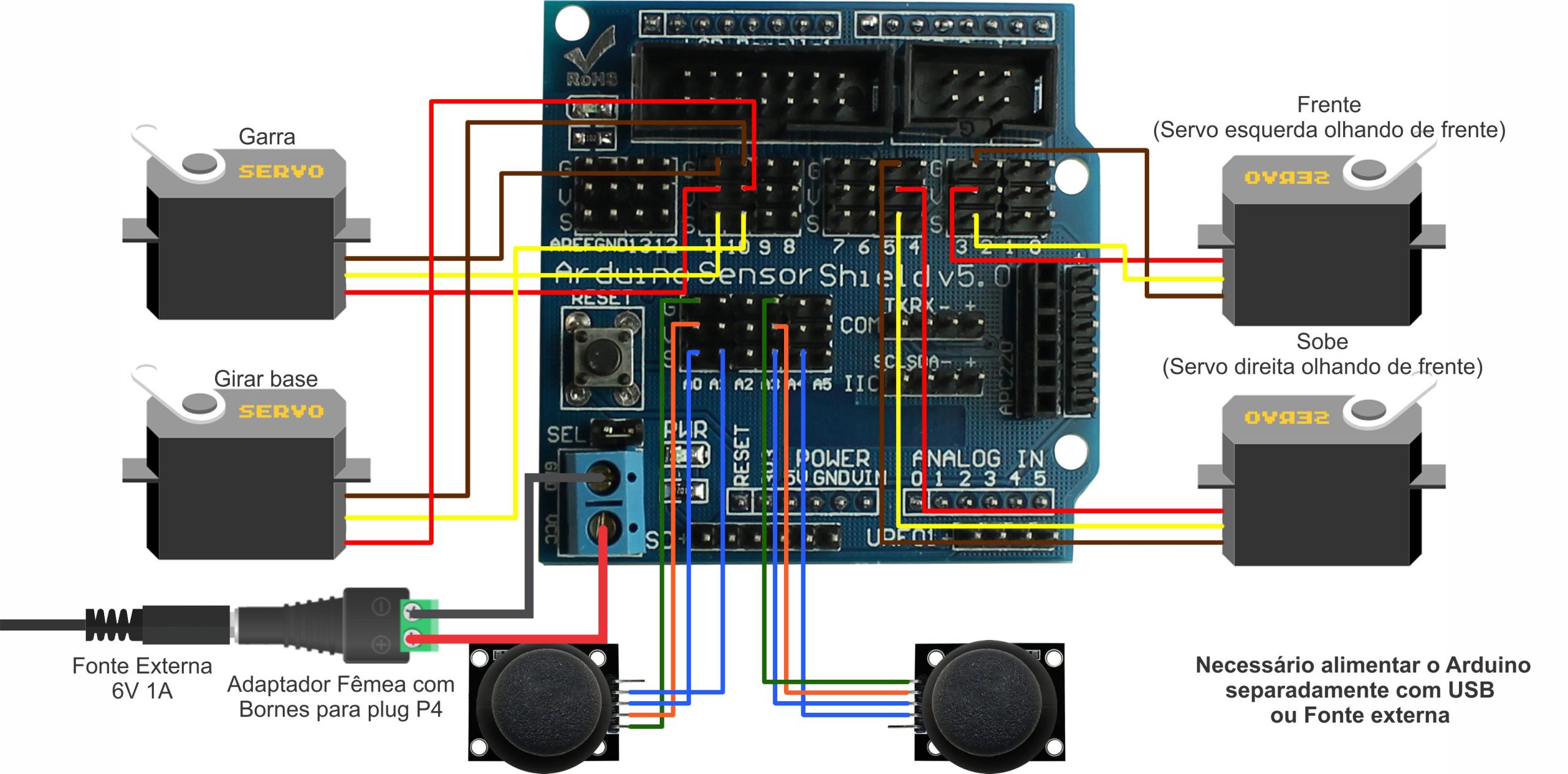 Devido ao consumo de ambos os equipamentos, o recomendado é a utilização de uma fonte externa de aproximadamente 6V 1A para o shield que alimenta os servos e outra alimentação para o Arduino que pode ser via USB ou através de fontes de alimentação.