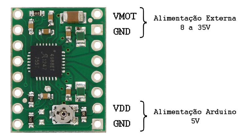 Para entendermos um pouco melhor o seu funcionamento, vamos explorar um pouco mais os seus pinos. Assim como a grande maioria dos drivers, o modelo A4988 possui duas conexões para fonte de alimentação, uma para a fonte externa que irá alimentar o Motor de Passo e que é representada pelos pinos VMOT e GND e uma para a alimentação do módulo e que será ligada diretamente do Arduino, representada pelos pinos VDD e GND.