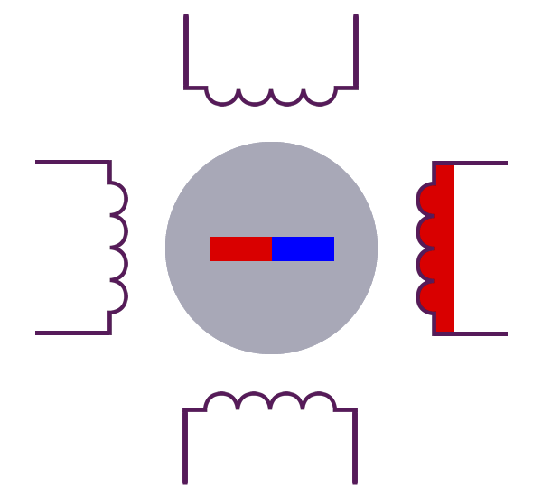 Na figura acima, podemos observar a ilustração de um motor de passo onde a bobina do topo está energizada e o eixo magnético é atraído e fixado pela mesma, desta maneira, a magnetização dos polos impede o movimento do motor e estabiliza sua posição.