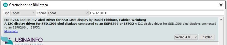 Para instalar a biblioteca, basta acessar o menu “Ferramentas”, na IDE do Arduino, e clicar em “Gerenciar Bibliotecas…”. Uma janela, ilustrada abaixo, irá aparecer. No canto superior esquerdo, digite “ESP32 OLED” e pressione “Enter”, no teclado. Assim que o gerenciador encontrar a biblioteca que precisamos, ele a exibirá conforme ilustrado abaixo. Por fim, clique em “Instalar” e aguarde o término do processo.