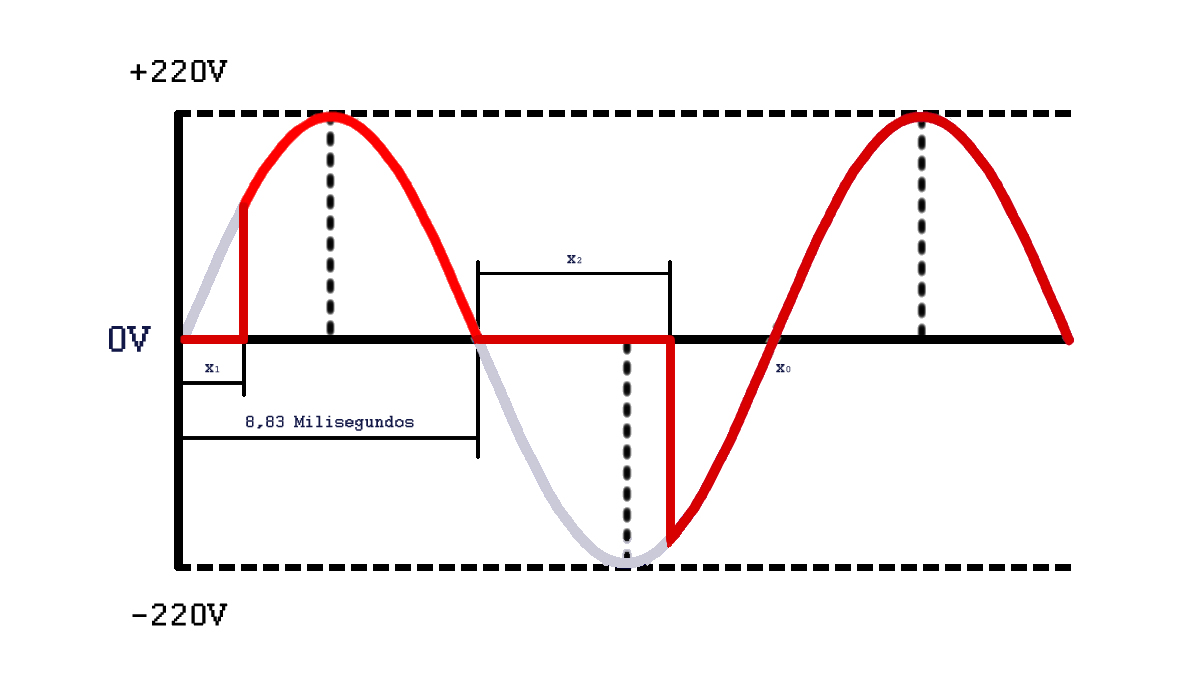 Na primeira crista observamos um valor x1 atribuído ao tempo em que a senóide permaneceu em 0V e quanto menor for este tempo maior será o brilho da lâmpada, no vale já podemos observar que o tempo em 0 foi bem superior através da variável x2 e consequentemente nestes casos menor será o brilho da lâmpada.