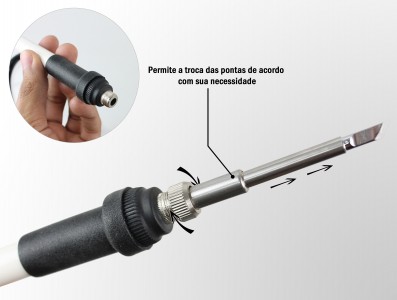 O sistema de encaixe da resistência é muito simples, basta desrosquear a ponta do ferro de solda, alocar a resistência com ponta integrada no interior do ferro e rosquear a ponta no local inicial.