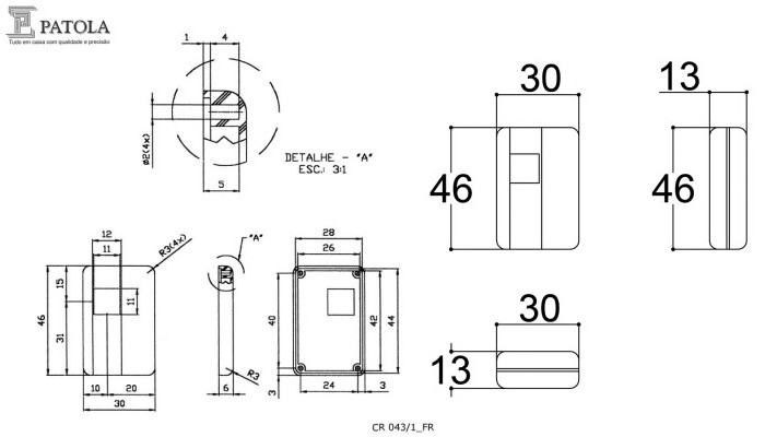 A Caixa Patola CR-043/1 possui acabamento fosco, contando com tampa com perfuração, a qual é fixada por meio de engates, contando com abertura para fixação de uma tecla quadrarda emborrachada (acompanha).
