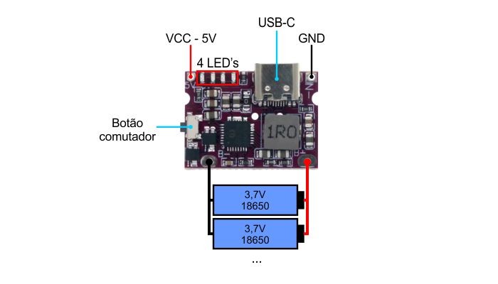 - Suporta configuração com múltiplas baterias 18650 em paralelo.