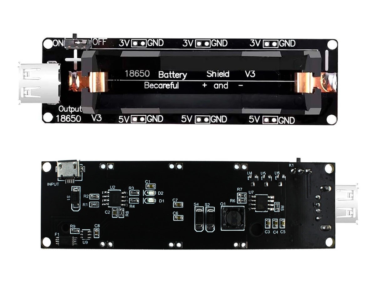 - Shield V3 Carregador de Bateria 18650 com USB, Saída 5V e 3V;