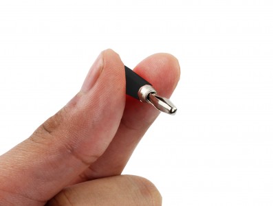 Ele possui conexões metálicas de 4mm (tamanho padrão) e é revestido por um material isolante plástico. Para utilização, é preciso desrosquear o isolamento, passar o fio por seu interior, fazer a solda com estanho no orifício metálico do borne e rosquear o isolamento novamente.