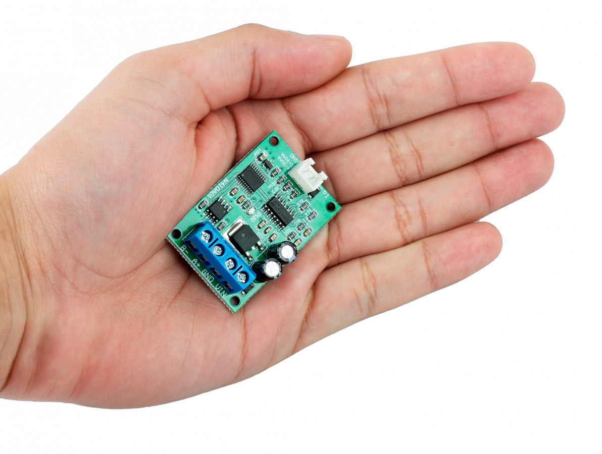 Para alimentação, é necessário utilizar tensões contínuas entre 12 a 25VDC via bornes a parafuso, identificados na placa como “GND” e “VIN”, já a comunicação RS485 (compatível com Modbus RTU) é feita pelo mesmo tipo de bornes, mas identificados como “B-” e “B+”.