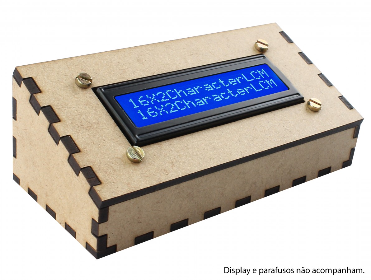 Ele conta com cortes precisos a laser com excelente padrão de acabamento e encaixe, além de contar com abertura exata para um display 16x2 e para a saída dos jumpers que fazem conexão com o microcontrolador.