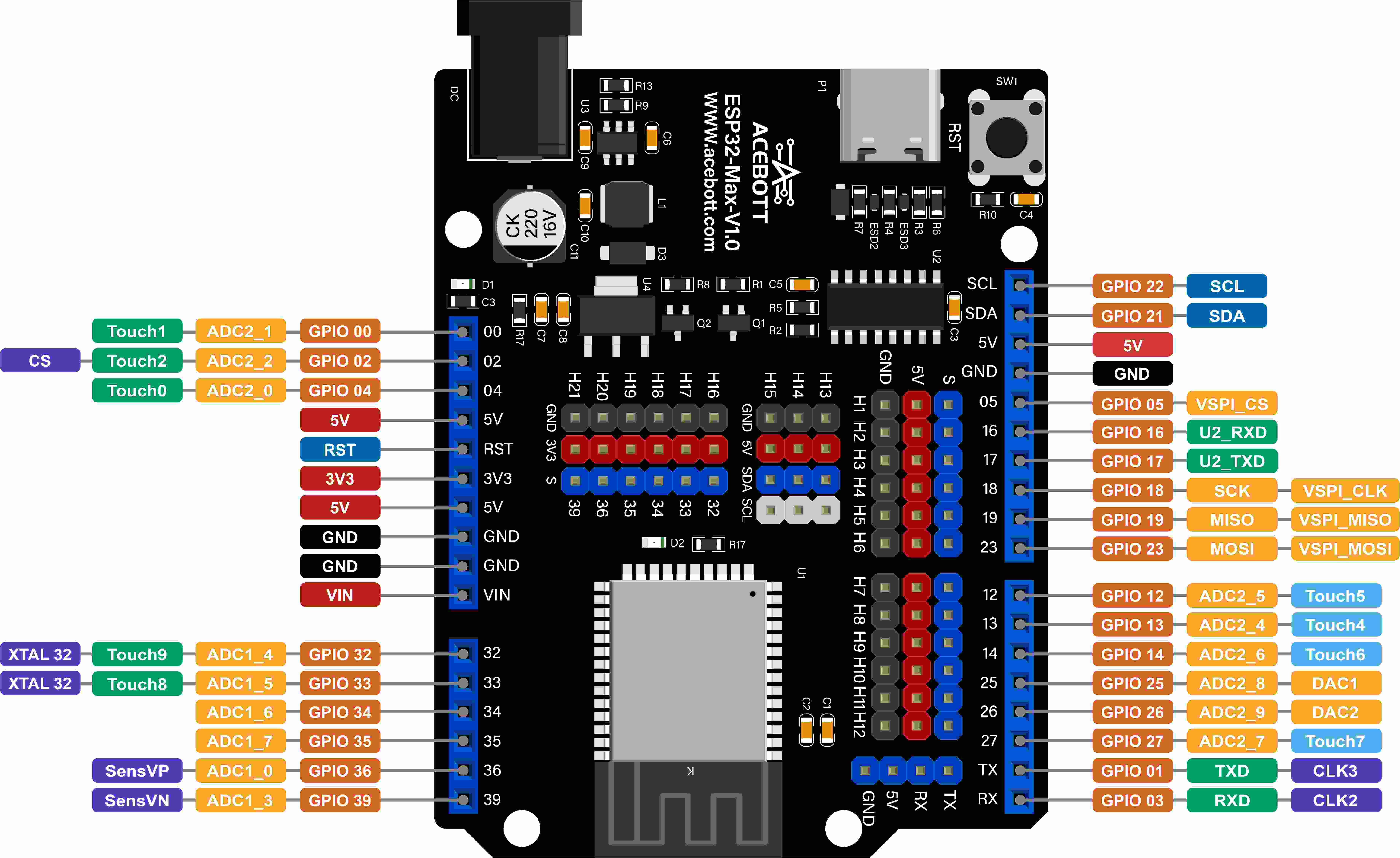 Compatível com o Shield Acebott QA052 ESP32 Car Shield V1.0, a Placa ESP32 Max amplia suas possibilidades para projetos robóticos, veículos inteligentes e plataformas educacionais.