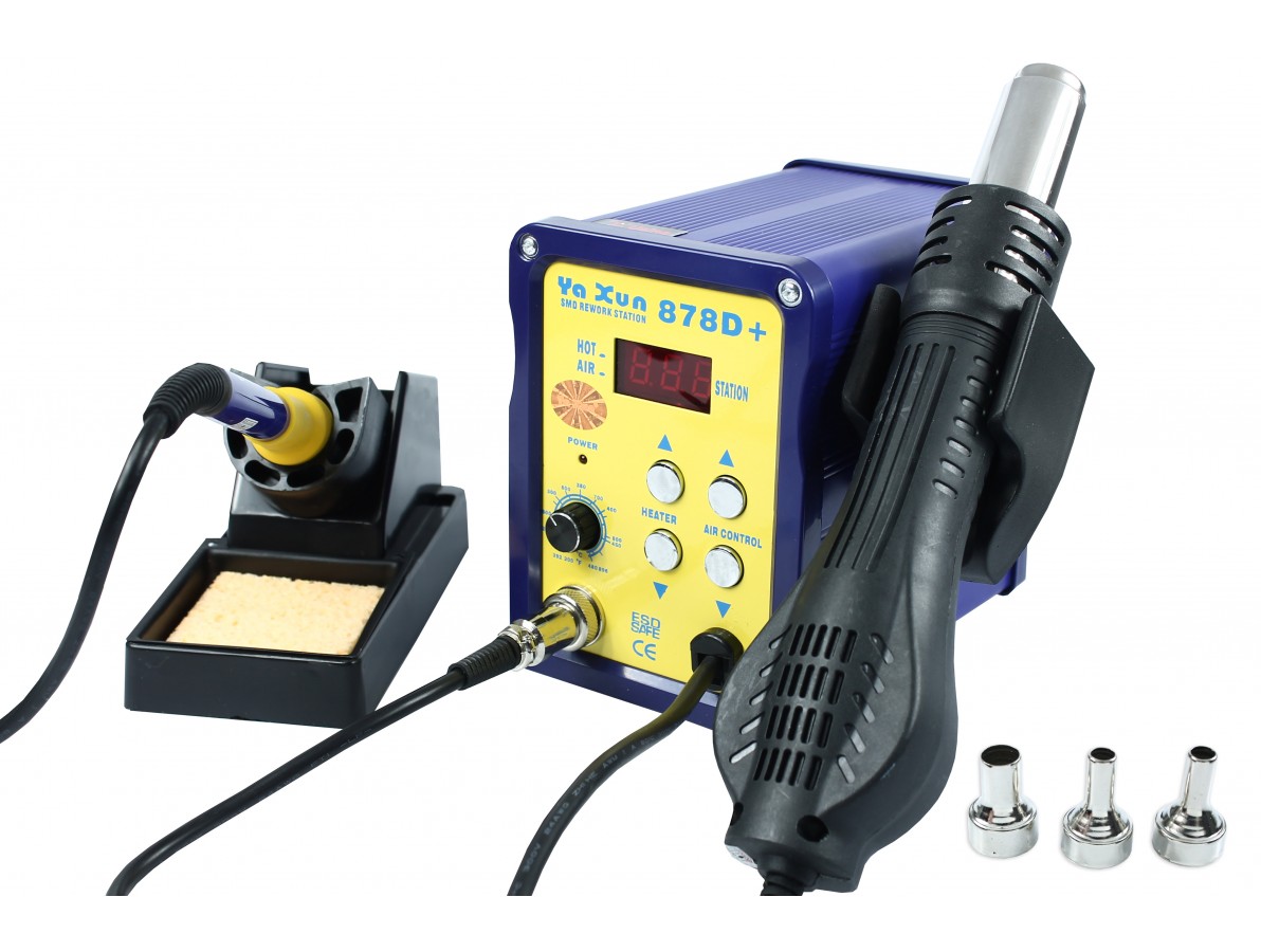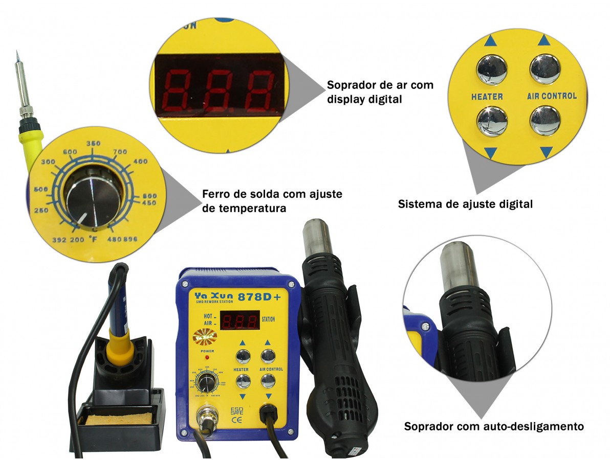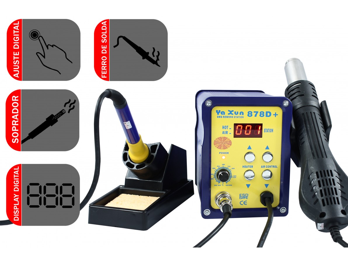A Estação de Solda e Retrabalho 2 em 1 Yaxun 878D+ 220V é o produto para quem busca praticidade e agilidade nas bancadas industriais. Com essa estação é possível trabalhar em reparos da maneira funcional e muito segura, pois conta com um eficaz sistema de proteção contra descargas de energia eletrostática (ESD).