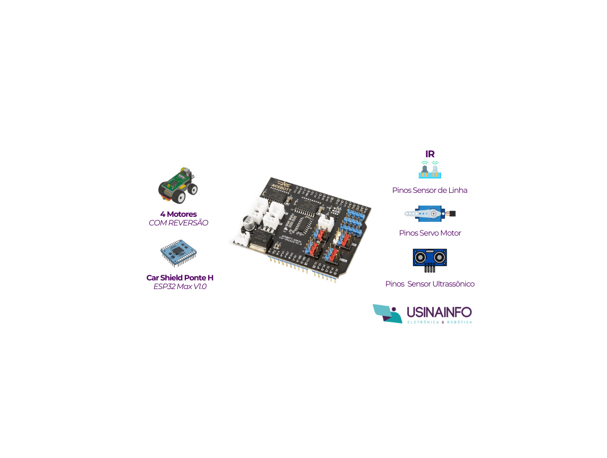 Equipado com dois CI L293D, cada um contendo duas pontes H completas, o shield permite controlar até quatro motores DC com direção e velocidade independentes (PWM), entregando 600 mA contínuo por canal (1A de pico), ele pode operar motores de 6 a 15V DC. Além disso, ainda traz conexões dedicadas para sensor ultrassônico HC-SR04, servos, sensor de linha e pinos específicos para Serial e I2C, facilitando todas as ligações.