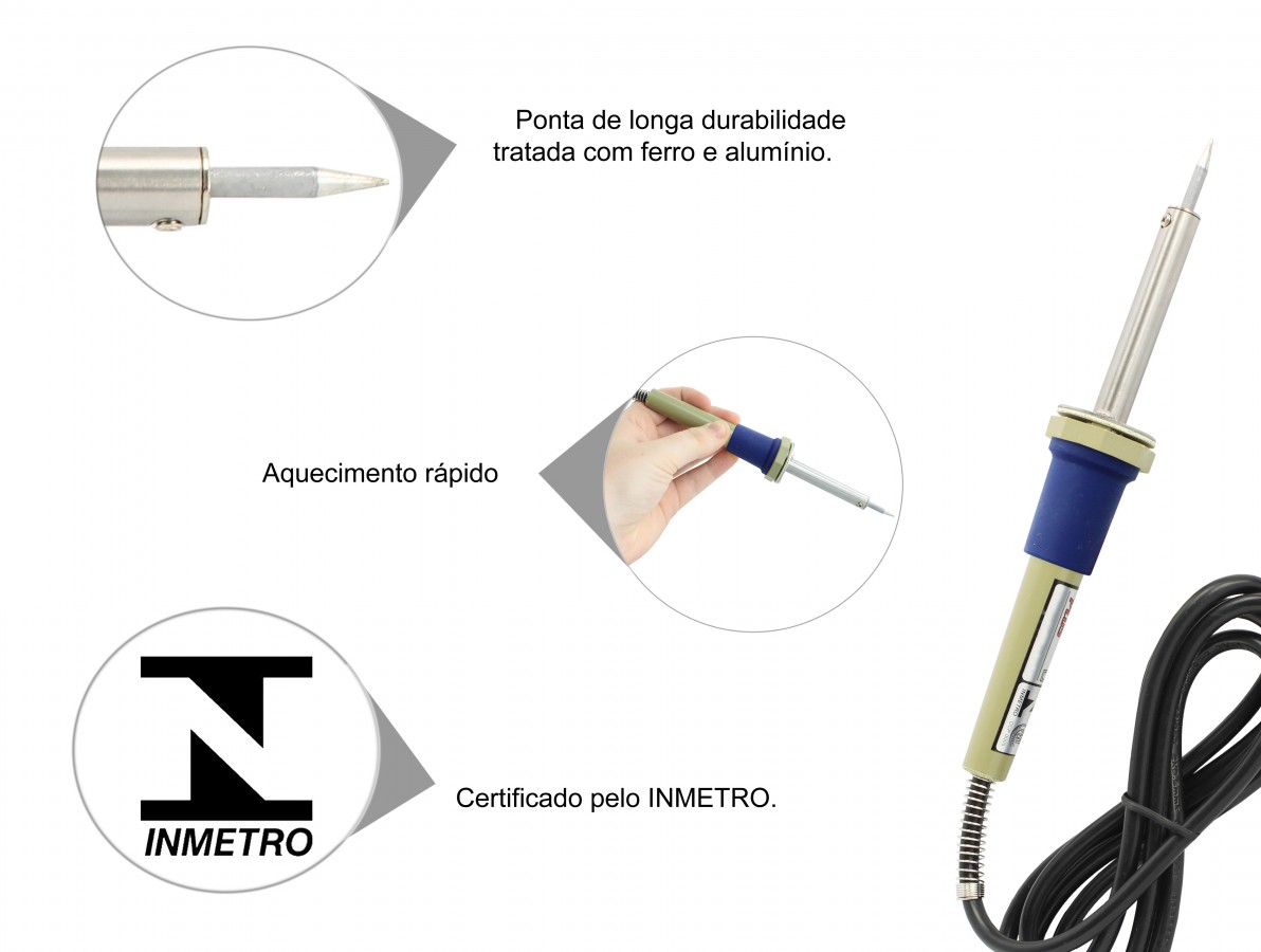 - Este Ferro de Solda é um produto de excelente qualidade, sua manopla é desenvolvida com material isolante para evitar possíveis acidentes, conta também com resistência de mica, cabo de força de acordo com o novo padrão brasileiro e base em metal para suporte.