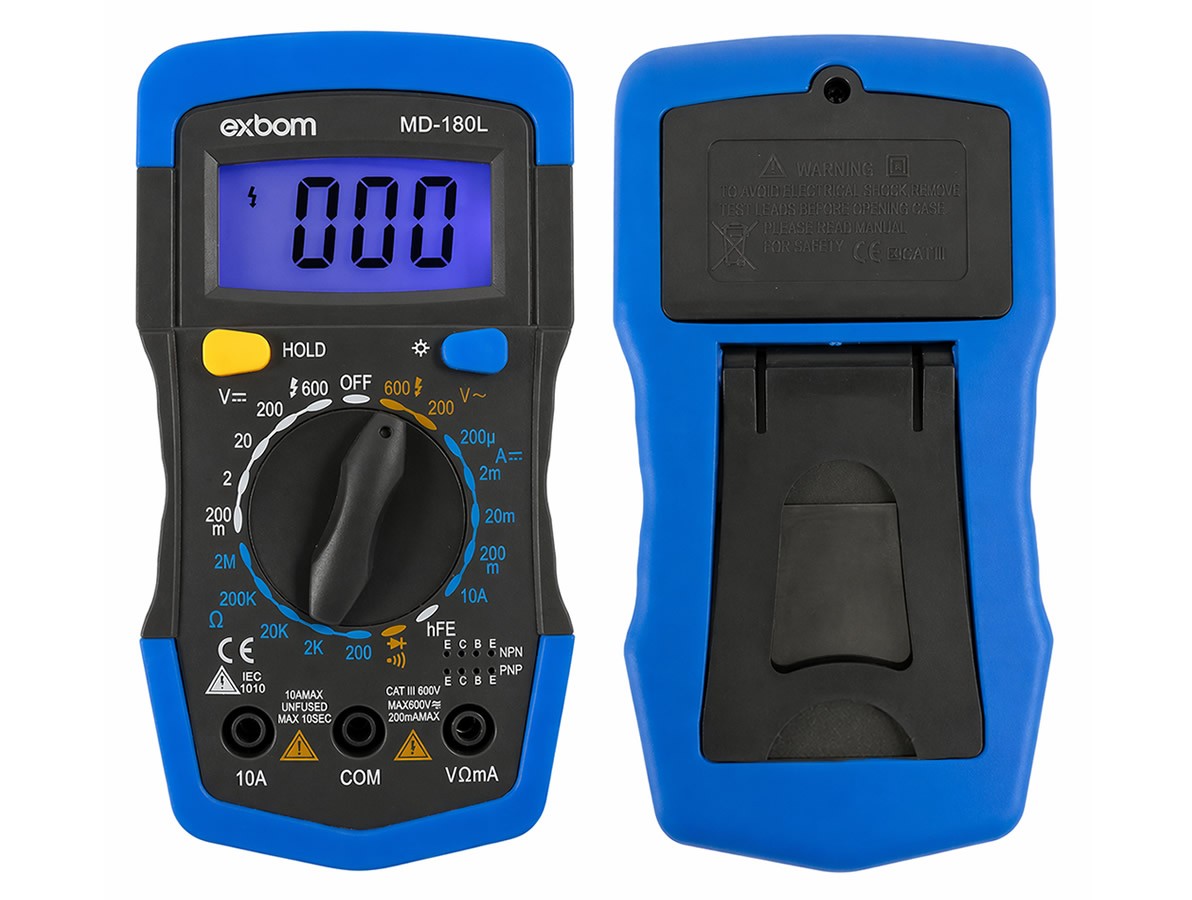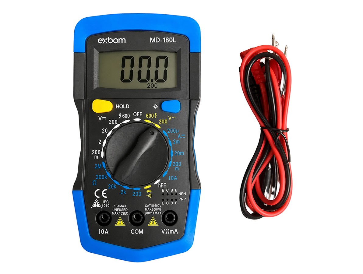 Capaz de medir tensão DC e AC até 600V, corrente contínua até 10A, resistência, além de testes de continuidade, diodo e hFE de transistores, o MD-180L atende a uma ampla variedade de aplicações, como manutenção elétrica, testes em circuitos eletrônicos e diagnósticos básicos. Seu display com iluminação de fundo facilita a leitura em ambientes com pouca luz, enquanto a função HOLD permite travar a medição para maior praticidade.