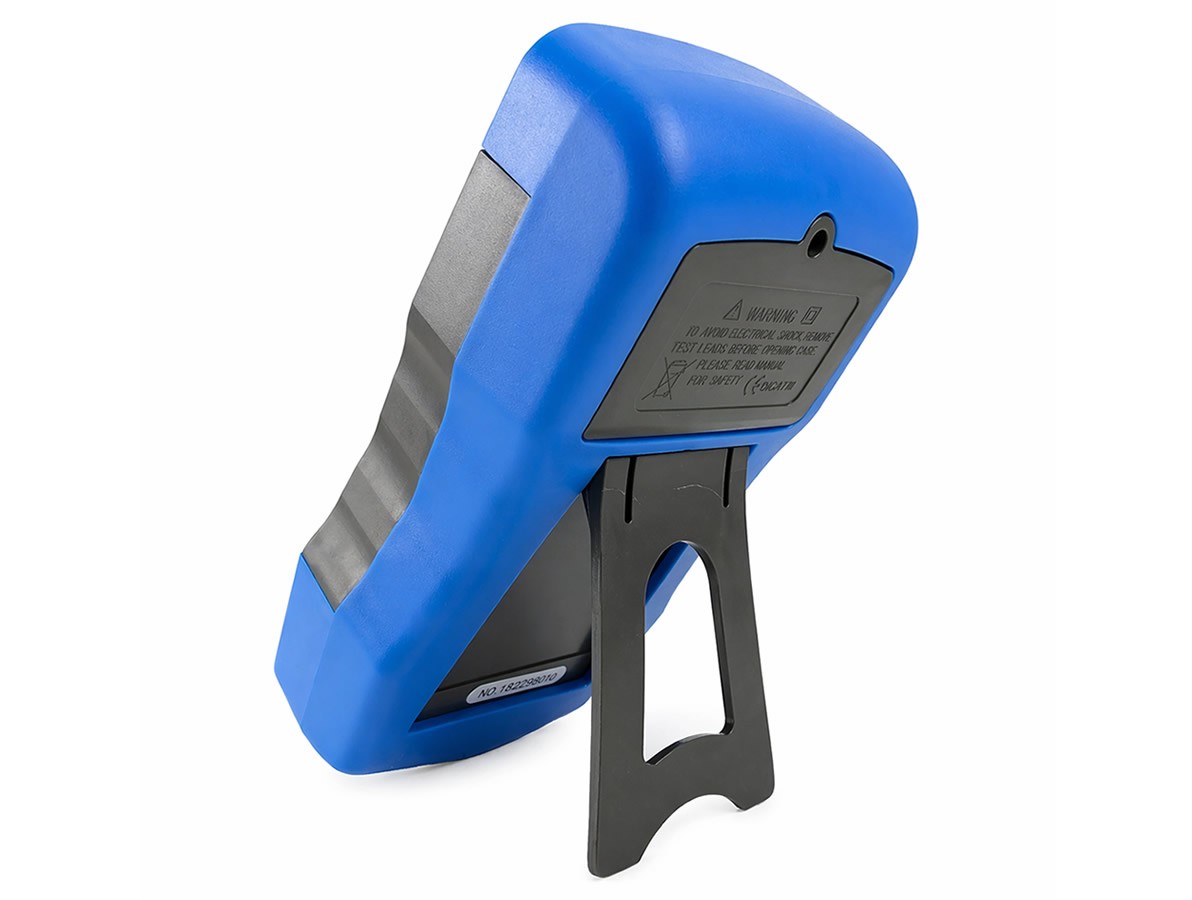 Na parte traseira, possui um suporte articulado que mantém o multímetro inclinado em aproximadamente 120°, melhorando a visualização do display durante o uso em bancada. Acompanha pontas de prova e bateria de 9V, estando pronto para uso.