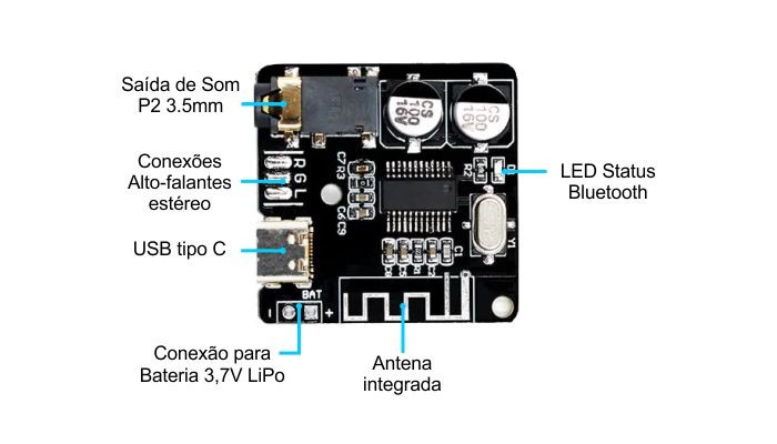 Ele possui saída P2 e também terminais estéreo para alto-falantes. Com sua saída P2 é possível utilizar em amplificadores ou colocar em rádios, permitindo utilizar o bluetooth de maneira simples. Conta também com terminais para bateria 3,7V a 5V ideal para transformar seu projeto em um portátil.