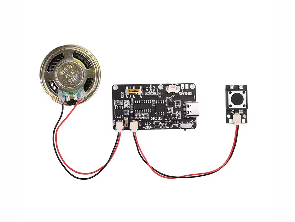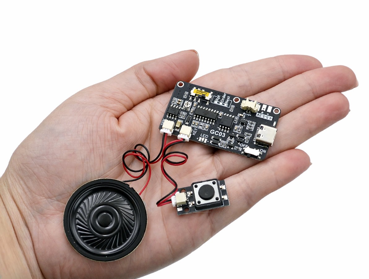 O GC03 conta com alto-falante de 8 ohms / 0,5 W, controle de volume ajustável por micro potenciômetro na própria placa e botão de interação para controle da reprodução. Além disso, oferece diferentes modos de funcionamento selecionáveis por chave, permitindo reprodução em loop, sequência ou avanço de faixas.