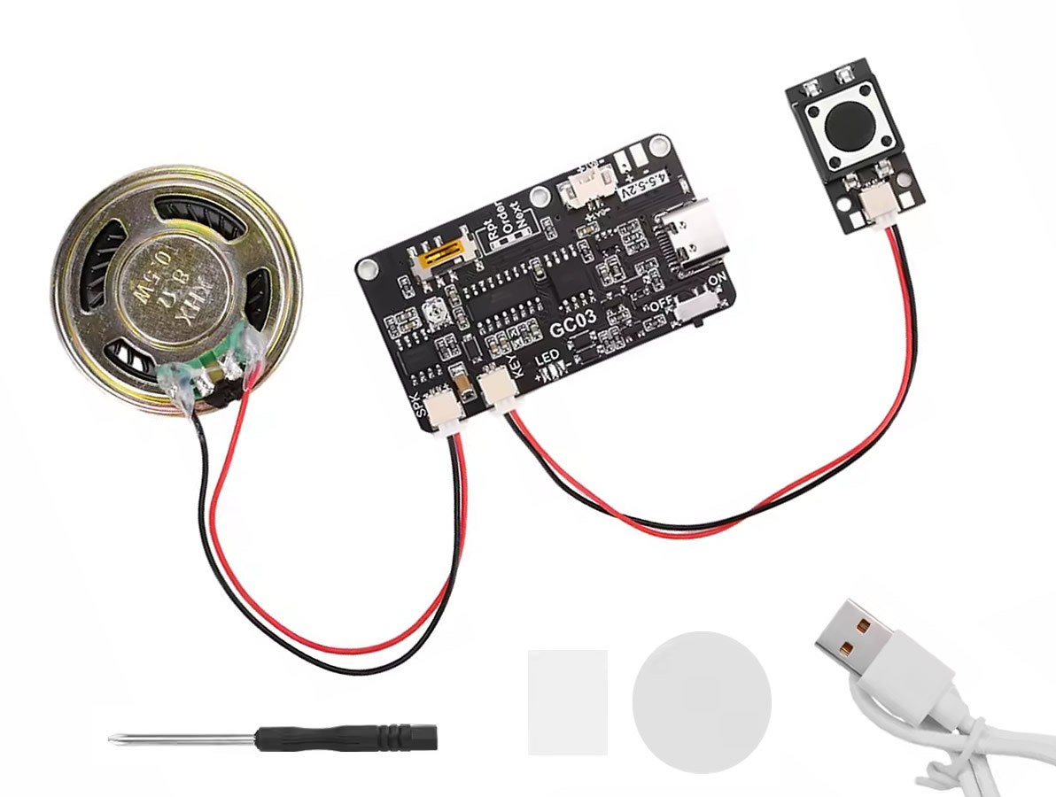O conjunto acompanha chave de fenda, cabo USB-C e adesivos dupla face, facilitando a fixação do alto-falante e do botão em caixas ou estruturas personalizadas.