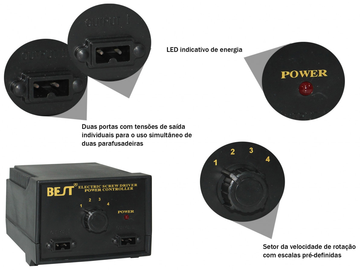 Com o intuito de atender a demanda das parafusadeiras, de uma maneira geral, a Fonte de Alimentação Universal BT-115D, também conhecida como “controlador de energia”, conta com duas portas com tensões de saída individuais, para o uso simultâneo de até duas parafusadeiras.