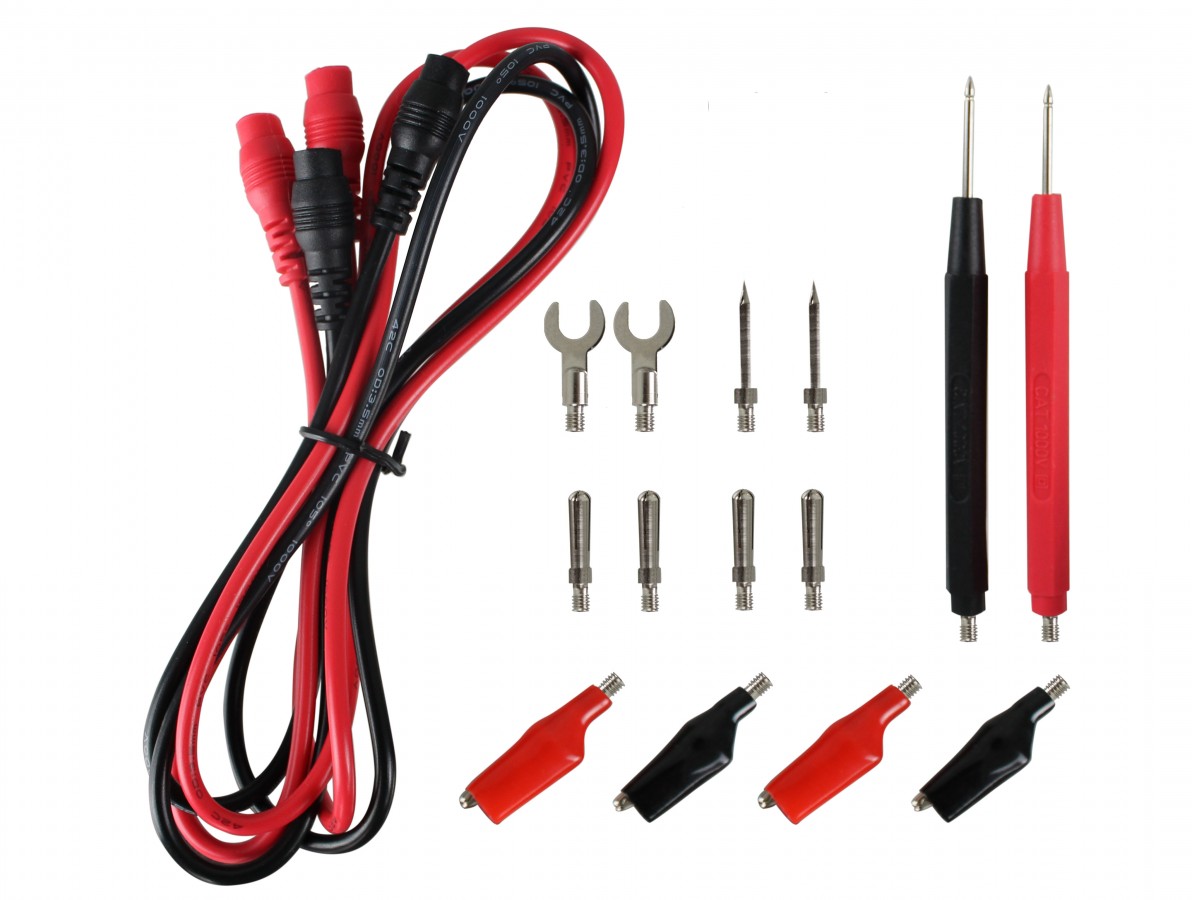 Muito completo, apresenta entre os acessórios um par de pontas de prova compridas isoladas, um par de pontas de prova curtas, um par de conectores forquilha, dois pares de garras jacaré e dois pares de conectores banana 4mm.