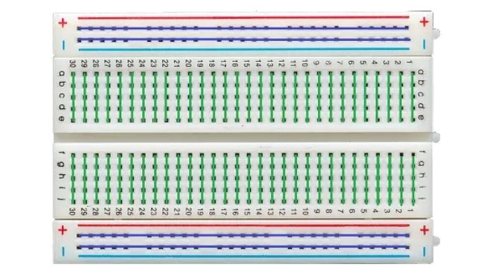 Já nas bordas laterais da Protoboard, encontramos as linhas de alimentação, com o terminal positivo em vermelho e o negativo em preto ou azul, que se estendem por toda a placa.