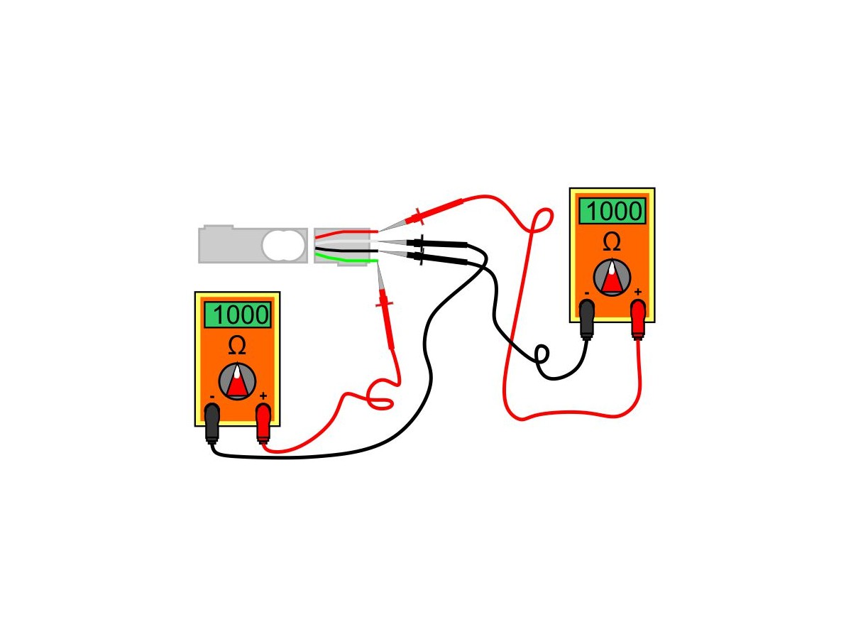 É possível realizar testes em sua célula de carga, para verificar se está em bom estado. Utilize um multímetro na escala de resistência e meça os pares vermelho e preto, que devem apresentar resistência aproximada de 1000Ω (ohms), variando 50Ω para mais ou para menos.